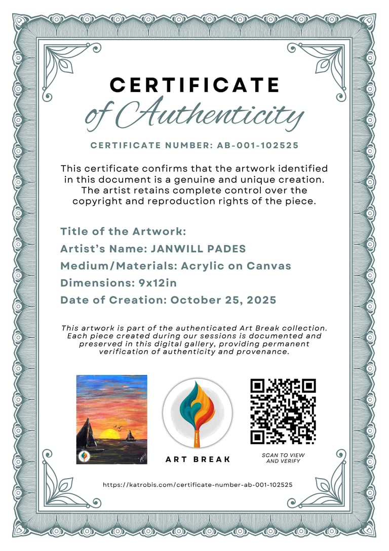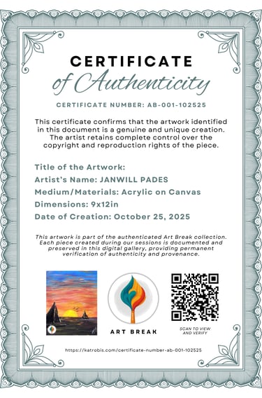 This artwork was created during an official Art Break painting session. This certificate serves as verification of the artwork's authenticity, creation date, and provenance. Each Art Break artwork is documented and preserved in our digital gallery for permanent record keeping.