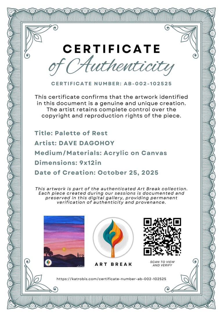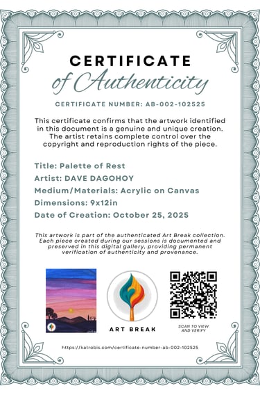 This artwork was created during an official Art Break painting session. This certificate serves as verification of the artwork's authenticity, creation date, and provenance. Each Art Break artwork is documented and preserved in our digital gallery for permanent record keeping.
