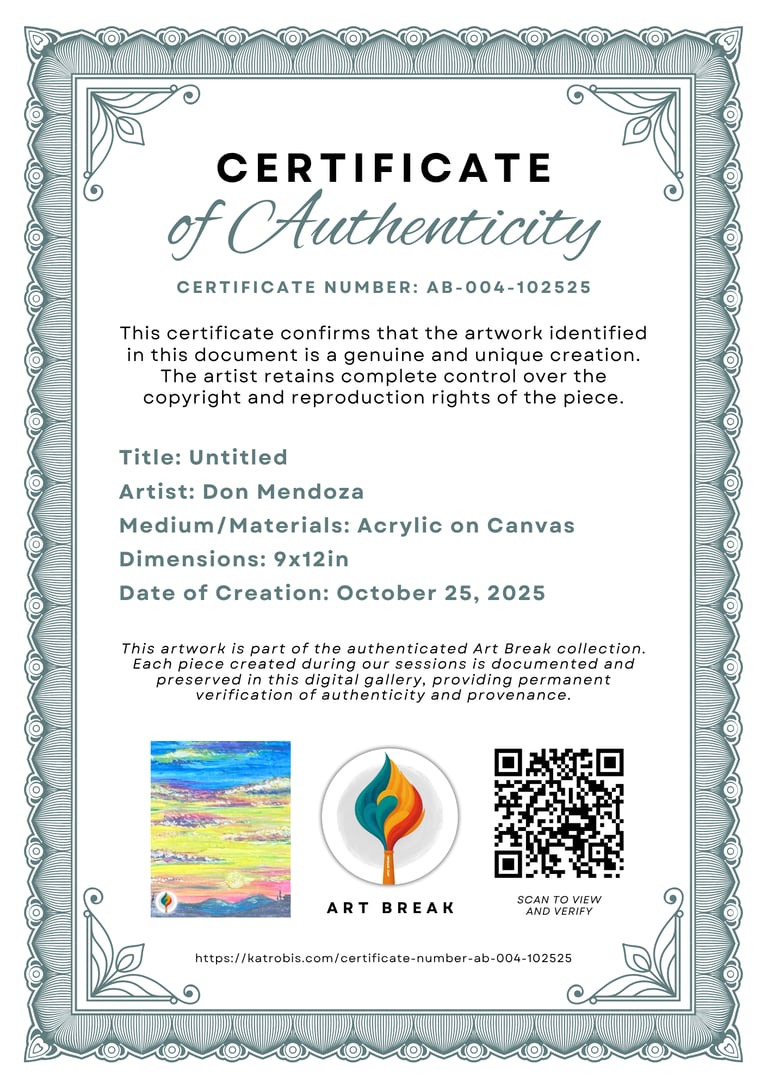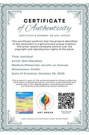 This artwork was created during an official Art Break painting session. This certificate serves as verification of the artwork's authenticity, creation date, and provenance. Each Art Break artwork is documented and preserved in our digital gallery for permanent record keeping.