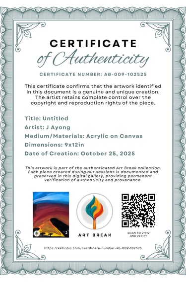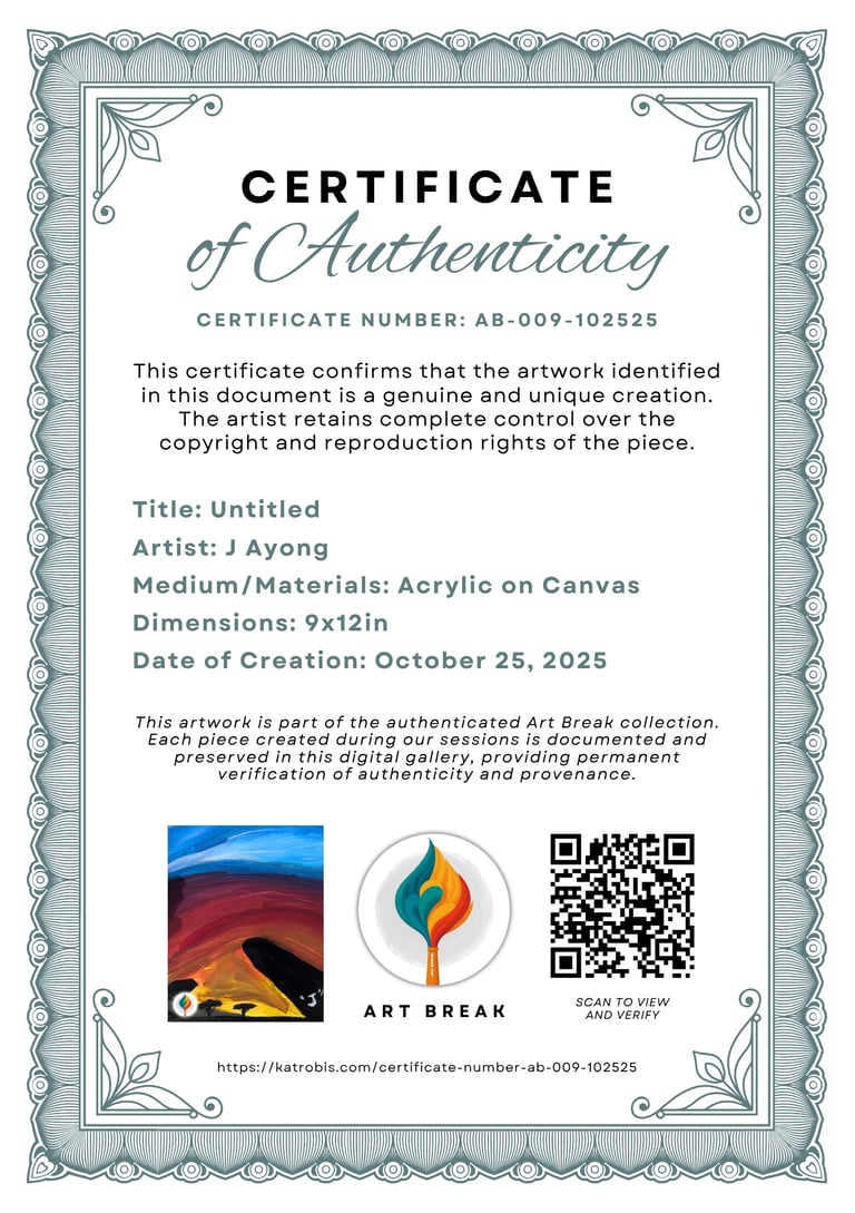 This artwork was created during an official Art Break painting session. This certificate serves as verification of the artwork's authenticity, creation date, and provenance. Each Art Break artwork is documented and preserved in our digital gallery for permanent record keeping.