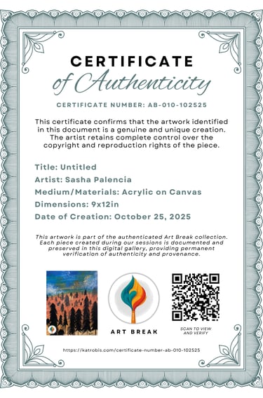 This artwork was created during an official Art Break painting session. This certificate serves as verification of the artwork's authenticity, creation date, and provenance. Each Art Break artwork is documented and preserved in our digital gallery for permanent record keeping.