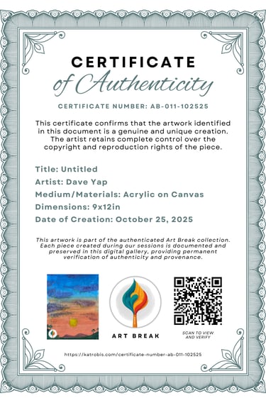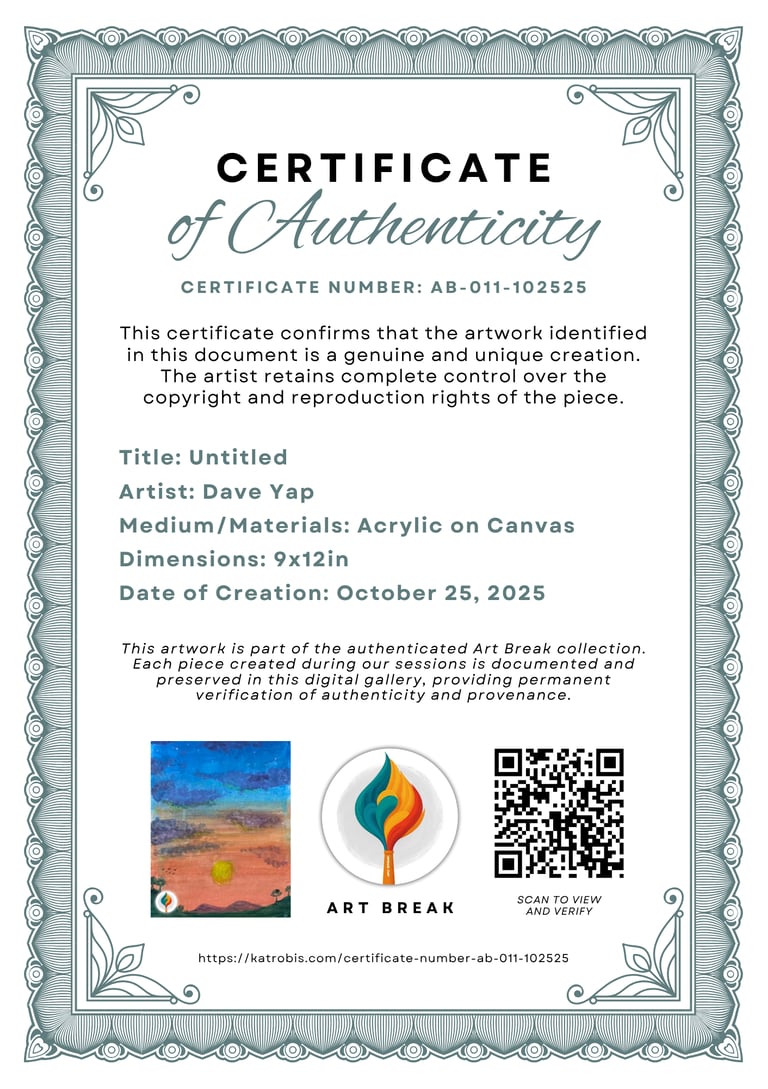 This artwork was created during an official Art Break painting session. This certificate serves as verification of the artwork's authenticity, creation date, and provenance. Each Art Break artwork is documented and preserved in our digital gallery for permanent record keeping.