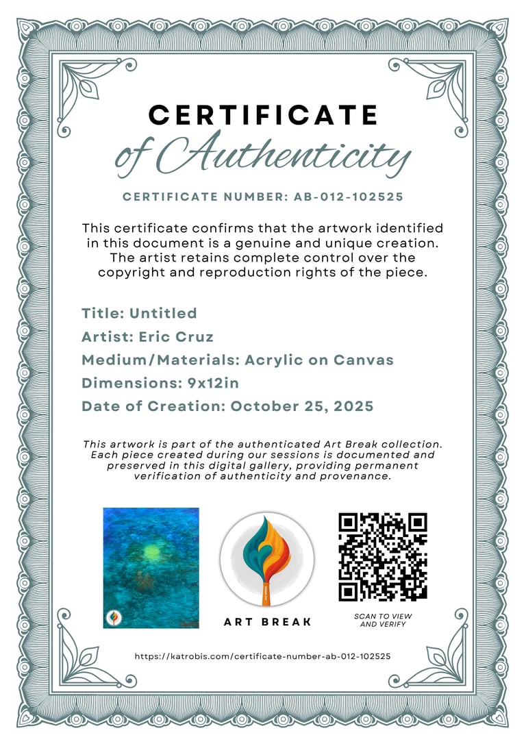 This artwork was created during an official Art Break painting session. This certificate serves as verification of the artwork's authenticity, creation date, and provenance. Each Art Break artwork is documented and preserved in our digital gallery for permanent record keeping.