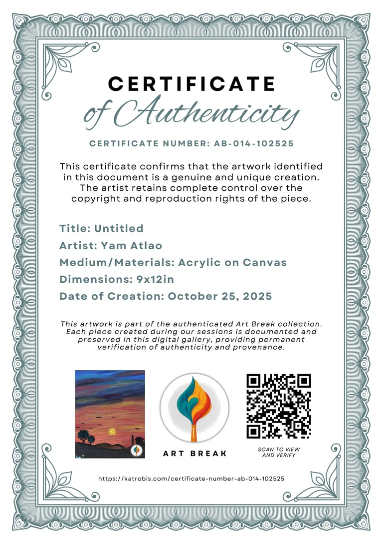 This artwork was created during an official Art Break painting session. This certificate serves as verification of the artwork's authenticity, creation date, and provenance. Each Art Break artwork is documented and preserved in our digital gallery for permanent record keeping.